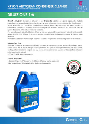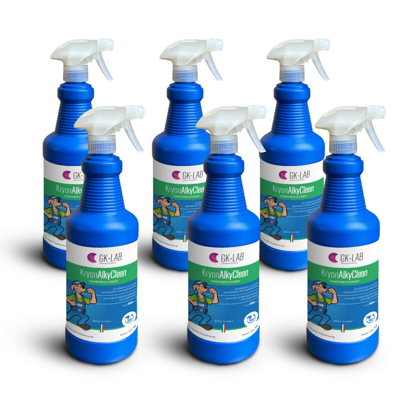 GK-Lab Kryon® AlkyClean is a specific alkaline detergent designed for application on the condensers of outdoor units for air conditioners and HVACR systems. Its formula is designed to eliminate environmental dirt, grease, atmospheric deposits, and difficult residues that accumulate on finned coils, hindering heat exchange and reducing system efficiency.