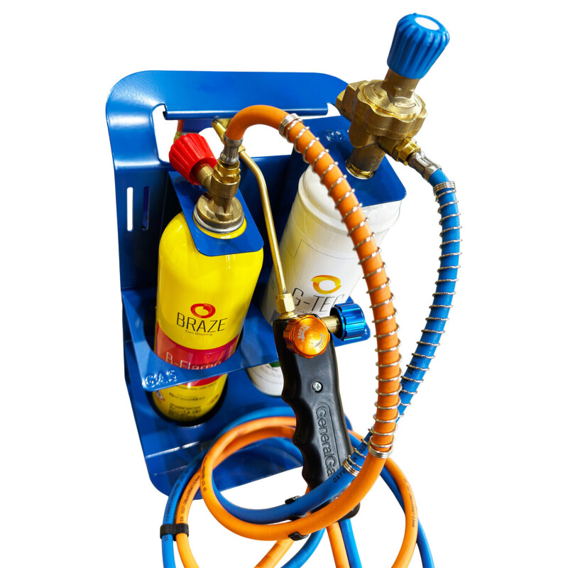 The MINIFLAME Brazing Kit with Regulators is a compact yet complete solution for performing high-performance soldering and brazing operations, even in tight spaces. The kit is mounted on a sturdy angled metal frame with a handle, making it easy to transport and preventing tipping during use. It also includes cylinder locking systems to ensure proper positioning and safety during operation.