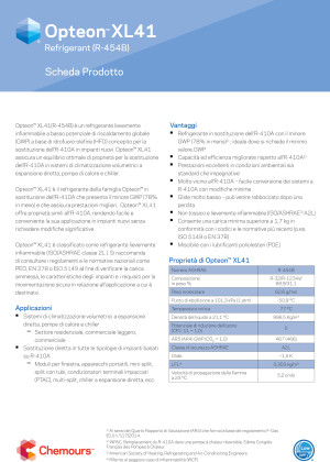 Opteon® XL41 (R-454B) is a mildly flammable (ISO/ASHRAE Class A2L), low-GWP, HFO-based refrigerant designed to replace R-410A in air conditioning systems, heat pumps, and chillers, offering comparable or superior performance.