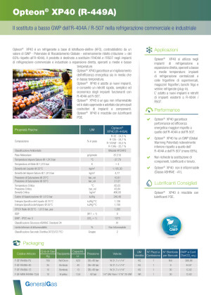 Opteon® XP40 (R-449A) is an HFO-HFC refrigerant blend developed to ensure high performance in medium- and low-temperature refrigeration. Thanks to its low Global Warming Potential (GWP), it reduces environmental impact by more than 65% compared to traditional R-404A and R-507 refrigerants. It is ideal for both new installations and for the quick, cost-effective retrofitting of existing systems using R-404A/R-507.