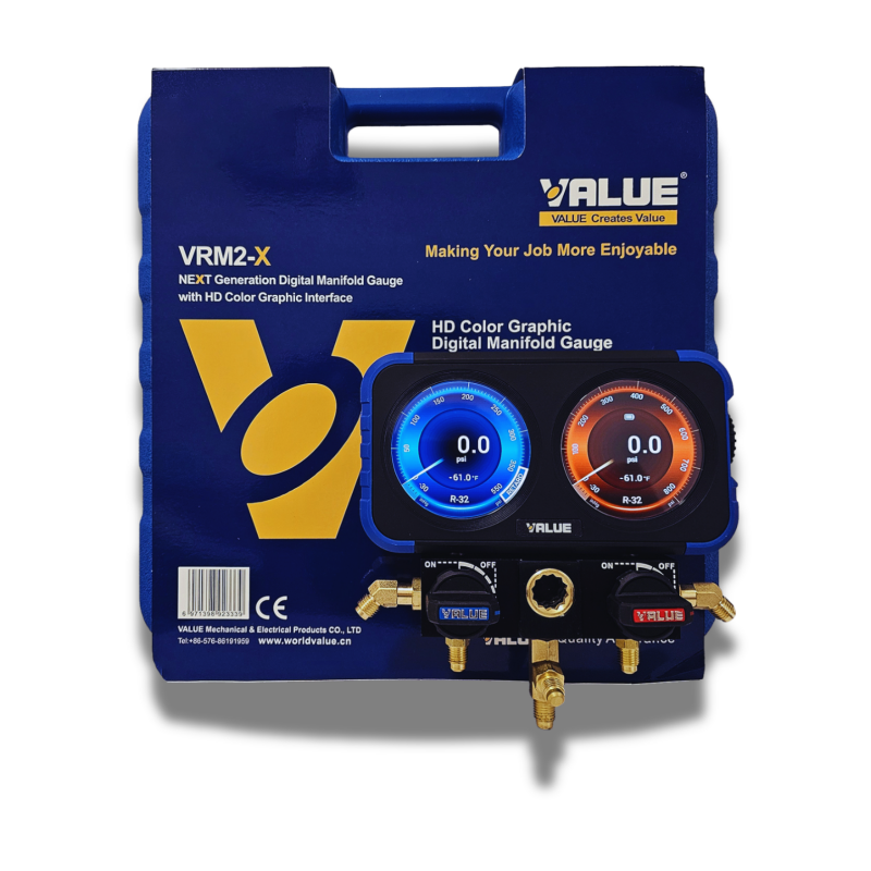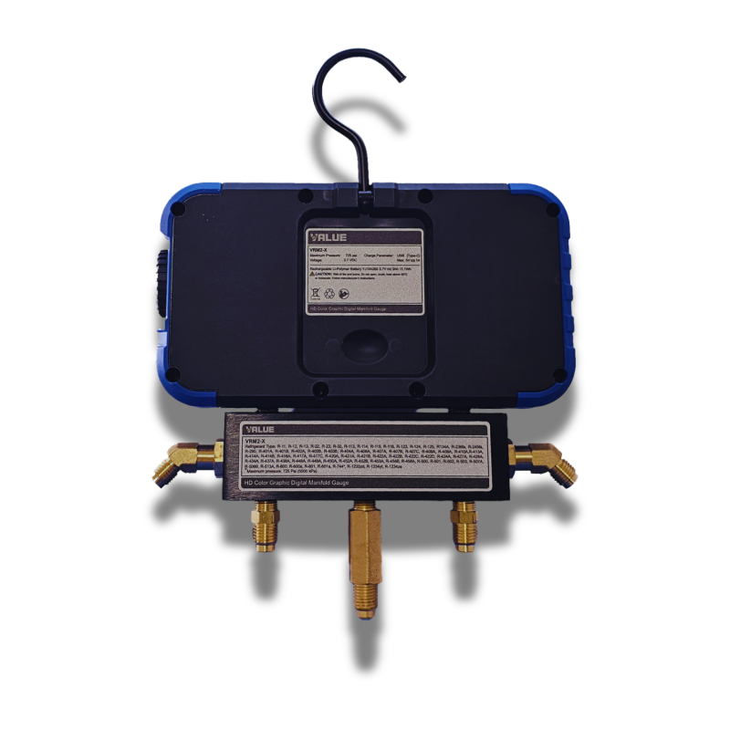The VALUE VRM2-X represents an advanced solution for HVAC/R technicians who require a precise, intuitive, and versatile digital manifold. At the heart of the device is an HD graphic display that provides clear visuals, smooth animations, and detailed real-time information, simplifying readings during field work.