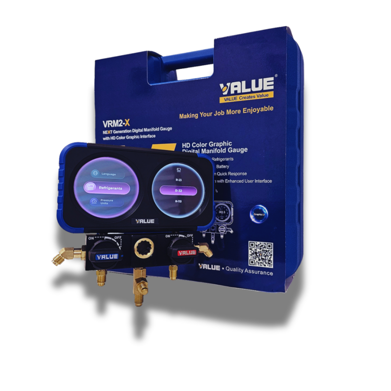 The VALUE VRM2-X is an innovative digital manifold gauge set featuring a full-color HD graphic display, designed for professional use in refrigeration and air conditioning systems. Compatible with a wide range of refrigerants, including Class A2L, it enhances efficiency, visibility, and measurement precision in a single compact and rugged instrument.