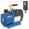 The VALUE VP8DSV digital vacuum pump is an advanced two-stage pump for HVAC/R applications, featuring a high flow rate of 226 L/min (8 CFM) and the ability to achieve a deep final vacuum of 15 microns (approximately 2×10⁻¹ Pa). Equipped with a backlit digital display and the VMV1S wireless digital vacuum gauge, it provides precise vacuum control, remote monitoring capabilities, and automated tools to optimize the evacuation process.